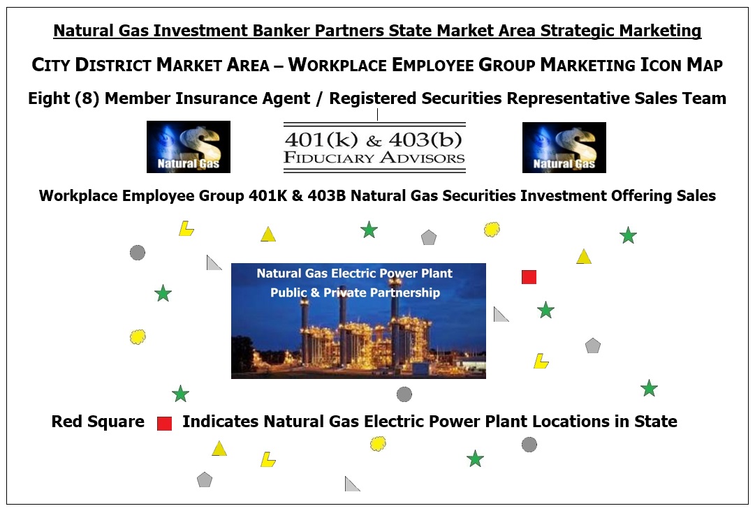 will have Contracts with Independent State Registered Securities Broker Dealers in one (1) or more State market areas, that will have eight (8) member Workplace Employee Benefit Specialist Sales Teams that will work in ten (10) City District Market Areas in each State Offering Natural Gas Securities.